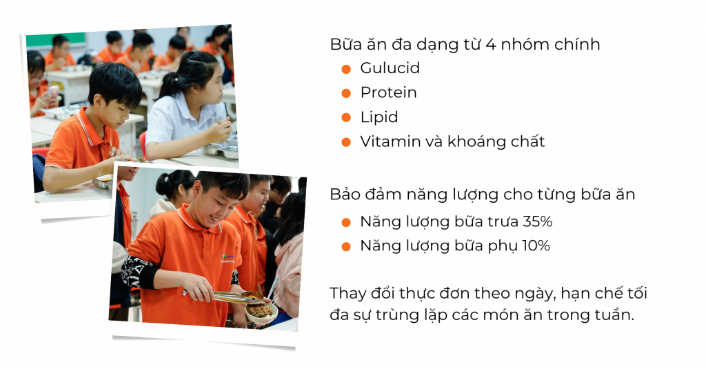 Tại FPT Schools, học sinh được tạo điều kiện tối đa để phát triển tư duy và thể chất. Việc đảm bảo yếu tố dinh dưỡng chính là chìa khoá quan trọng giúp học sinh có nền tảng sức khoẻ tốt nhất để đáp ứng cho việc học tập và rèn luyện. Nhà trường sẽ xây dựng thực đơn dinh dưỡng hợp lý phù hợp với các độ tuổi và thường xuyên thay đổi nhằm mang đến cho học sinh bữa ăn ngon miệng, đảm bảo vệ sinh, giàu dưỡng chất.