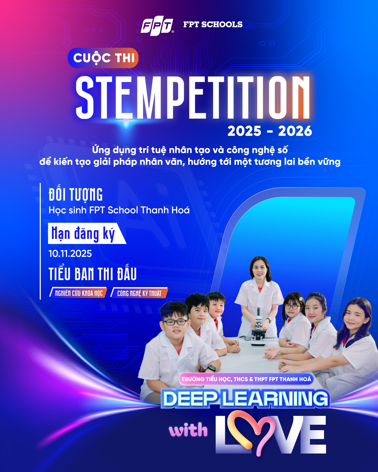 Năm học 2025 - 2026, cuộc thi STEMPETITION với chủ đề “ Deep Learning With Love” - Ứng dụng trí tuệ nhân tạo và công nghệ số để kiến tạo giải pháp nhân văn, hướng tới một tương lai bền vững gắn với 17 mục tiêu phát triển bền vững của Liên Hợp Quốc (UN SDGs). Nơi công nghệ được dẫn lối bởi trái tim yêu thương và trách nhiệm cộng đồng.