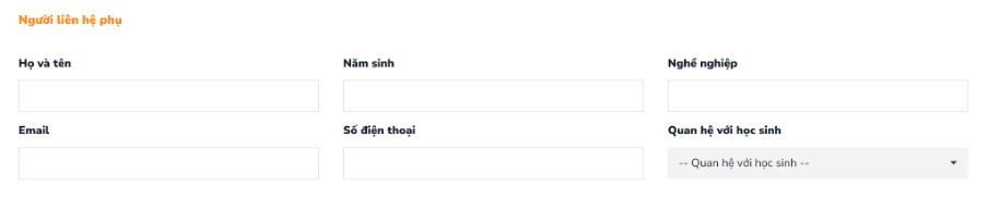 - Tại mục người liên hệ phụ, quý phụ huynh có thể điền thông tin bố/mẹ hoặc người thân mà nhà trường có thể liên hệ trong trường hợp không liên hệ được với người liên hệ chính.